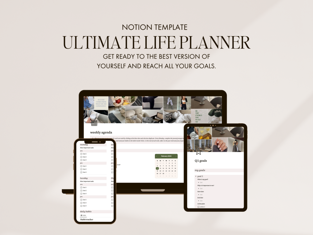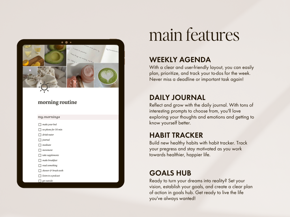 A full life planner with weekly agenda, daily journal, habit tracker, goal hub, meal planner and lot more.