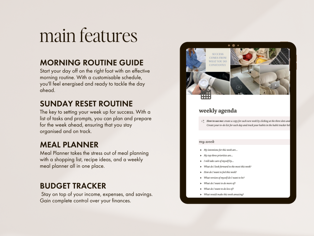 - Weekly agenda - stay on top of your to do list and prioritise the right actions to reach your long term goals